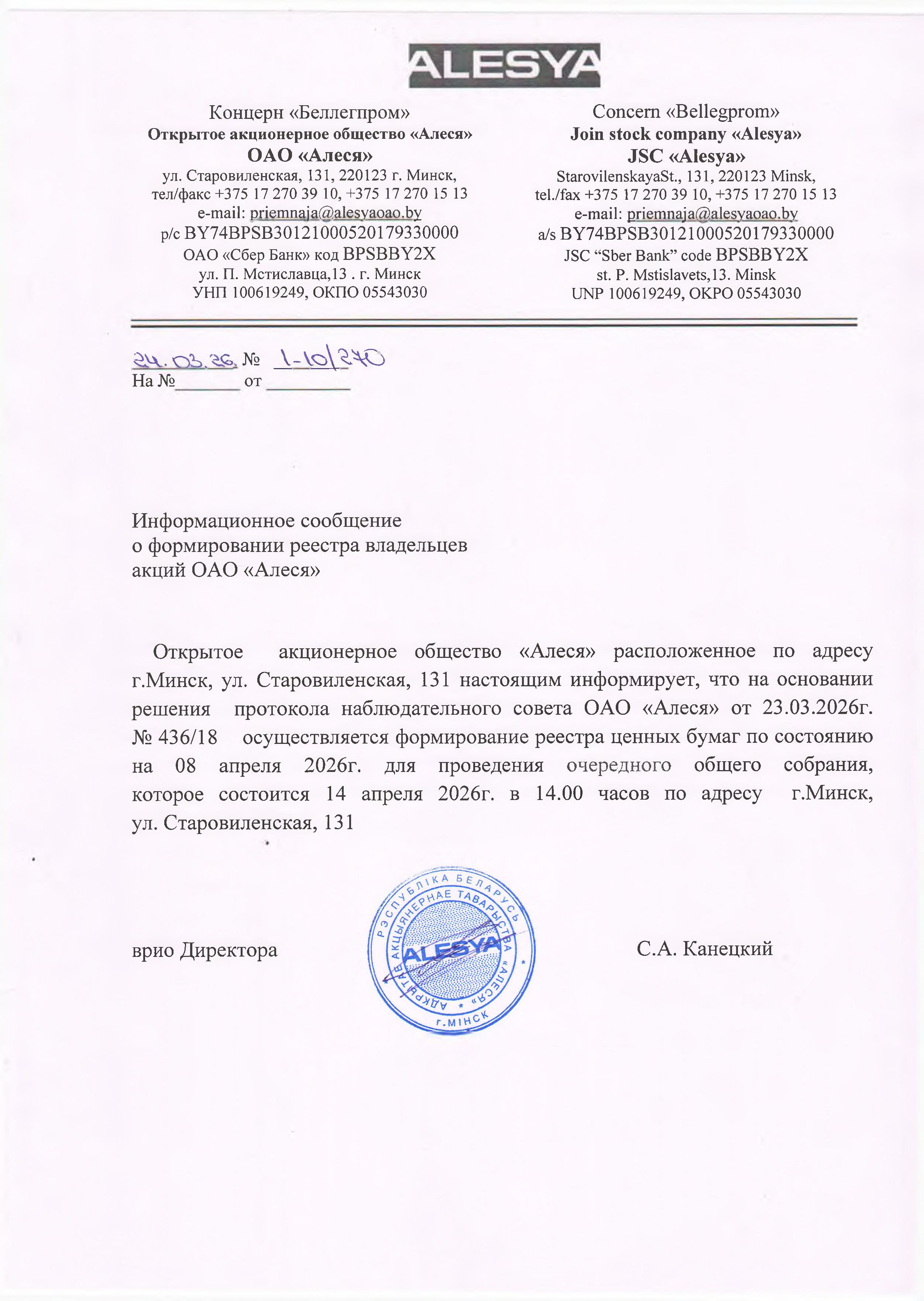 Внеочередное общее собрание акционеров ОАО «Алеся» 2025